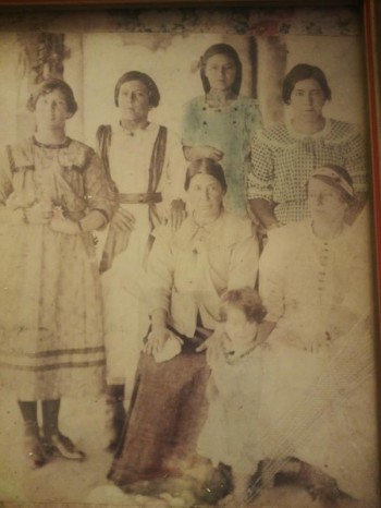 A lo largo de la conversación se me ocurrió preguntar si había alguna foto antigua donde pudiera ver los rostros de mis antepasados. Para mi total sorpresa apareció esta increíble fotografía donde aparece mi bisabuela a quien llamaban mamá Pragedes y a quien le estoy viendo la cara por primera vez en mi vida. En esta fotografía están, de izquierda a derecha, mi tía abuela Clotilde, a quien conocí ya muy viejita, luego mi tía abuela Anastasia, la más delgada y espigada es mi abuela Lucinda y a su lado otra de sus hermanas, Adela, quien murió de parto. Delante de ella mi tía abuela Balbina a quien también conocí y quien murió soltera y virgen, y en el medio la bisabuela mamá Pragedes con uno de sus nietos en su regazo, hijo de uno de sus hijos varones.